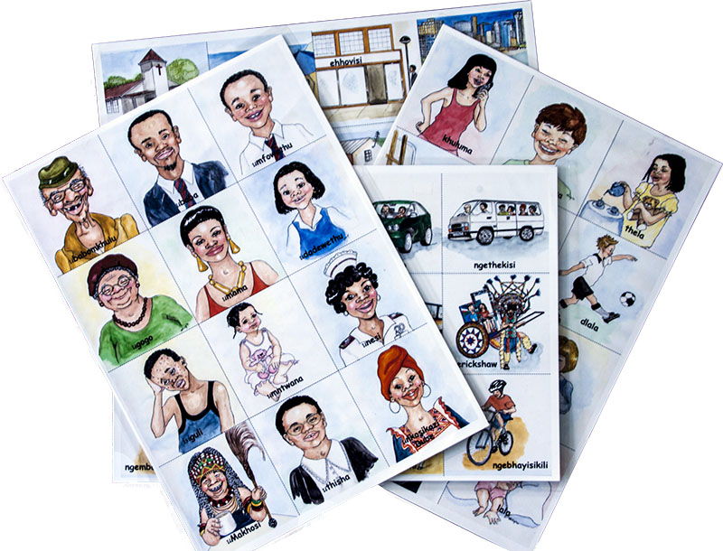 Four full colour posters for the teachers to use as support material. Size 840mm x 600mm. Charts show People; Verbs; Transport and Destinations. These charts can be cut into individual pictures, to aid sentence construction in oral or written work. Example. People picture / Umama then choose a verb picture / geza. Umama uya geza. Ubaba uhamba nge+transport picture. Ugogo uya transport picture ukuya destination picture. Learners copy the spelling from the cards when writing the sentences.